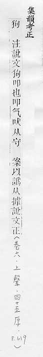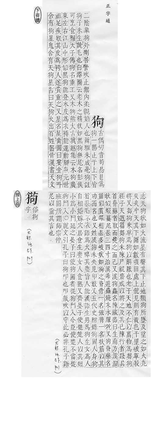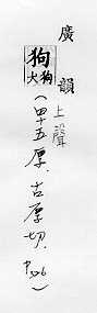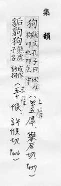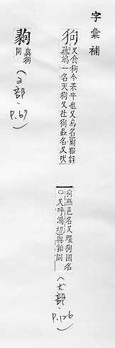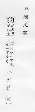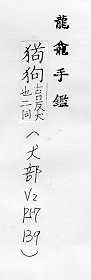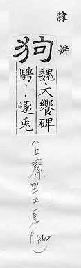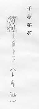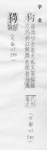 哺乳动物,种类很多,听觉嗅觉都很敏锐,善于看守门户,有的可以训练成军犬、警犬:走~。~彘(狗和猪)。~刨(páo )(一种游泳动作)。~盗(小偷)。~腿子。~仗人势。~尾续貂(喻拿粗劣的东西接到美好的东西后面,很不相称,常指文章)。
