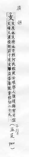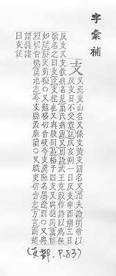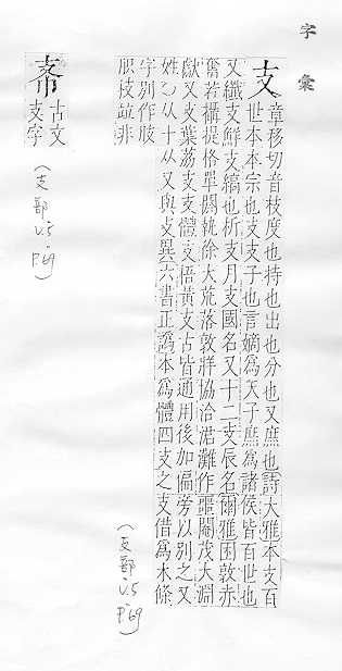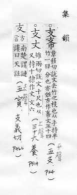撑持,伸出,竖起:~撑。~援。体力不~。 受得住:乐不可~。 领款或付款:~付。 调度,指使:~使。~应。~着儿。 附属于总体的一个部分:总~。~流。~离。 〔地~〕历法中用的十二个字:子丑寅卯辰巳午未申酉戌亥。 量词:一~笔。