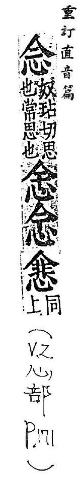 惦记,常常想:惦~。怀~。~头(思想、想法)。悼~。~旧。~物。 心中的打算,想法,看法:意~。杂~。信~。 说,读,诵读:~白(戏剧道白)。~叨。~经。~书。 廿的大写。 姓。