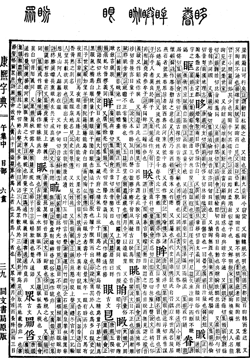 《广韵》去王切《集韵》《韵会》《正韵》曲王切,𠀤音筐。《玉篇》眼眶也。《集韵》目厓也。《列子·仲尼篇》矢来注眸子,而眶不睫。《张衡·西京赋》隅目高眶。《注》高眶,深童子也。 又通作匡。《史记·淮南王安传》涕满匡而横流。 《集韵》或作𩒑。