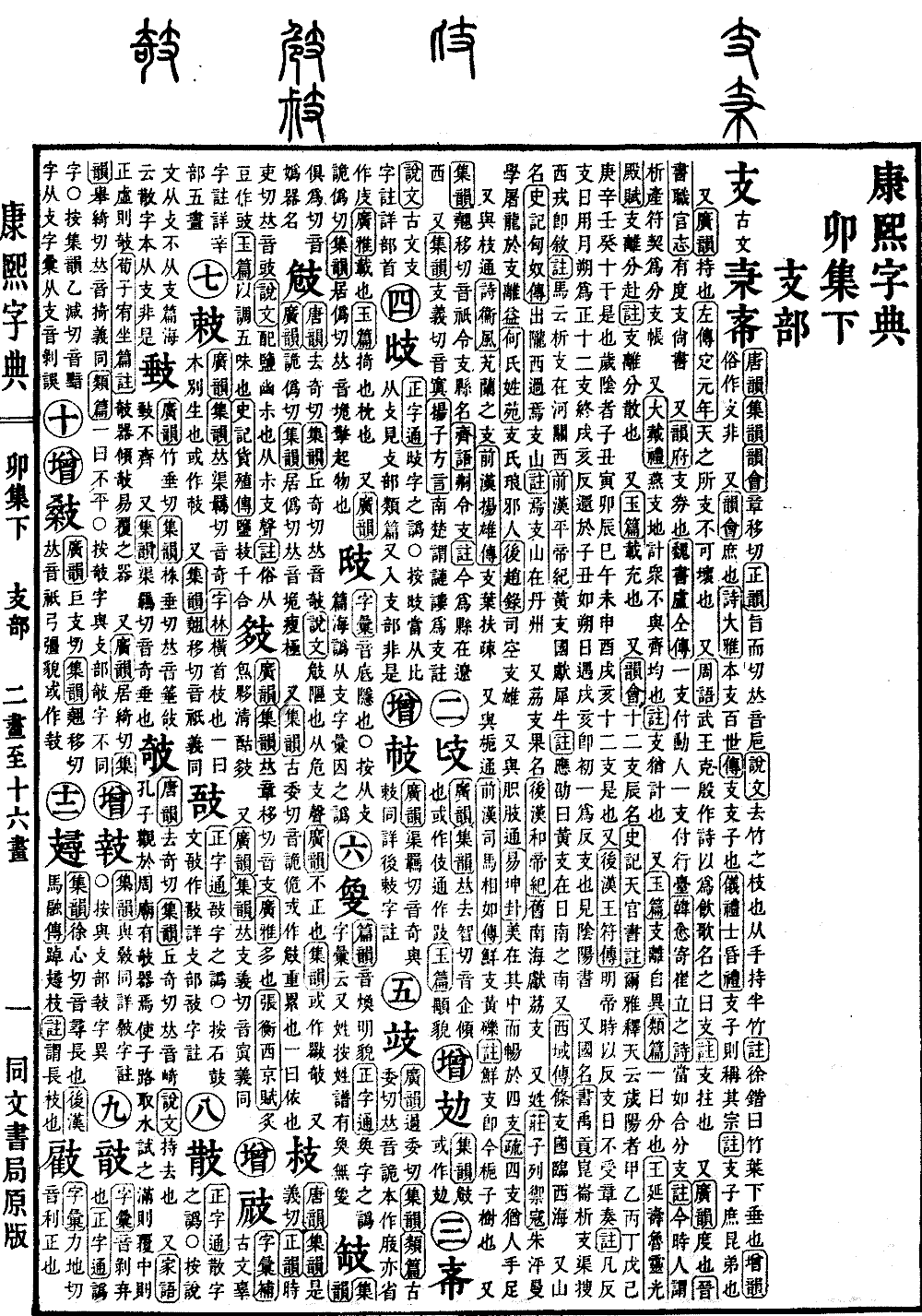 《唐韵》去奇切《集韵》丘奇切,𠀤音崎。《说文》持去也。 又《家语》孔子观于周庙,有攲器焉。使子路取水试之,满则覆,中则正,虚则攲。《荀子·宥坐篇注》攲器,倾敧易覆之器。 又《广韵》居绮切《集韵》举绮切,𠀤音掎。义同。《类篇》一曰不平。◎按攲字与攴部敧字不同。