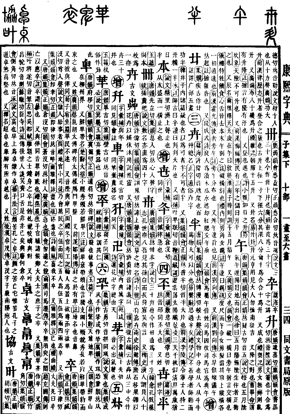 《唐韵》《集韵》《韵会》《正韵》𠀤藏没切,尊入声。《说文》隶人给事者。《周礼·地官·小司徒》乃会万民之卒伍而用之。五人为伍,五伍为两,四两为卒。又《唐韵》子律切《集韵》《韵会》即聿切《正韵》即律切,𠀤音啐。《尔雅·释诂》尽也。《疏》终尽也。《诗·衞风》畜我不卒。又《尔雅·释言》巳也。《礼·曲礼》大夫死曰卒。又《唐韵》《集韵》《正韵》仓没切《韵会》苍没切,𠀤村入声。《广韵》急也。《韵会》匆遽之貌。《前汉·司马迁传》卒卒无须臾之闲。《赵充国传》则亡以应卒。《注》卒谓暴也。又与倅同,音翠。副贰也。《礼·燕义》庶子,官职,诸侯,卿大夫,士之庶子之卒。又《集韵》崒亦作卒。又《韵补》叶将遂切,音翠。《左思·吴都赋》雕题之士,镂身之卒。比饰虬龙,蛟螭与对。又叶昌悦切,音测。《苏辙·功臣寺诗》流传后世人,谈笑资口舌。是非亦已矣,兴废何仓卒。*考证:〔《左思·吴都赋》雕题之士,镂身之卒。比饬虬龙,蛟螭与对。〕 谨照原文比饬改比饰。