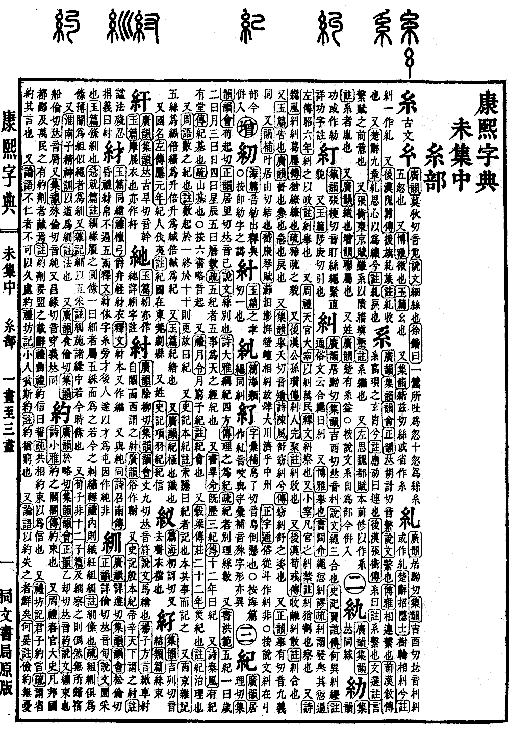 《广韵》详遵切《集韵》《韵会》松伦切《正韵》详伦切,𠀤音旬。《说文》圜采也。《玉篇》绦紃也。《急就篇注》紃,缘履之圆绦。一曰紃者,属五彩而为之,若今之剌绣鞾。《礼·内则》织纴组紃。《注》紃,绦也。《疏》组紃俱为绦。薄阔为组,似绳者为紃。又《杂记》紃以五采。《注》紃施诸缝中,若今时绦也。 又《荀子·非十二子篇》及紃察之,则倜然无所归宿。 又《淮南子·精神训》以道为紃。《注》法也。 又《广韵》食伦切《集韵》船伦切,𠀤音唇。又《集韵》殊伦切,音纯。又昌缘切,音穿。义𠀤同。