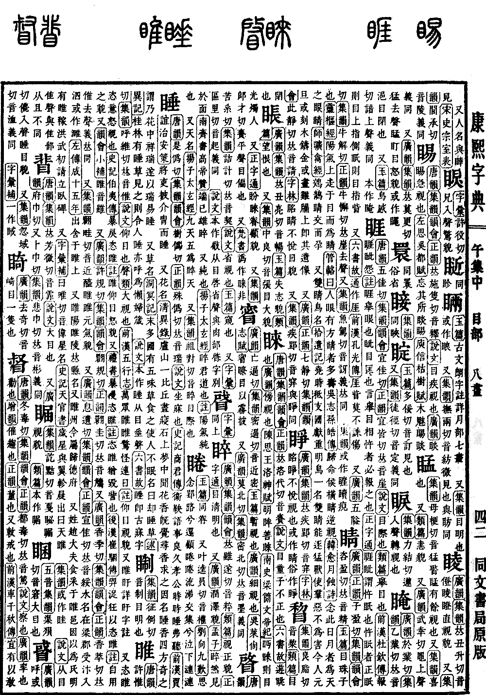 《唐韵》《集韵》《韵会》《正韵》𠀤洛代切,音赉。《说文》目童子不正也。《六书故》游眺也。《广韵》傍视也。《𨻰思王·洛神赋》明眸善睐。《南史·梁𥳑文帝纪》眄睐则目光烛人。 又《正字通》盼睐眷顾貌。 又《集韵》郞才切,赉平声。目偏也。 又《梵书》譌作睐,非。
