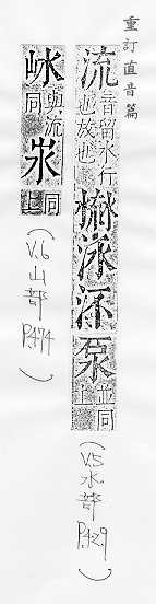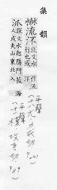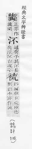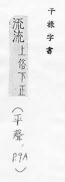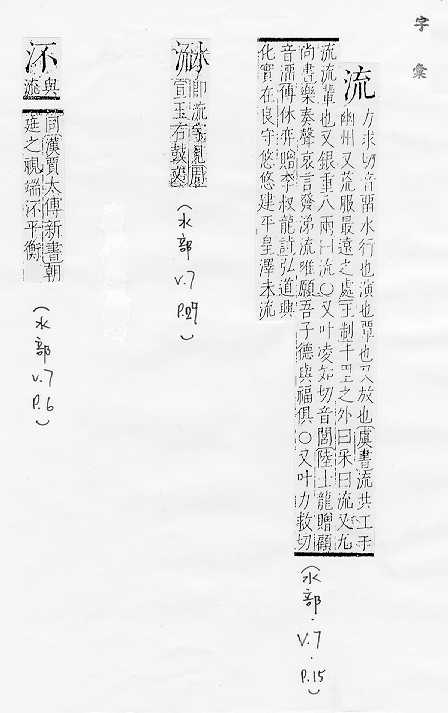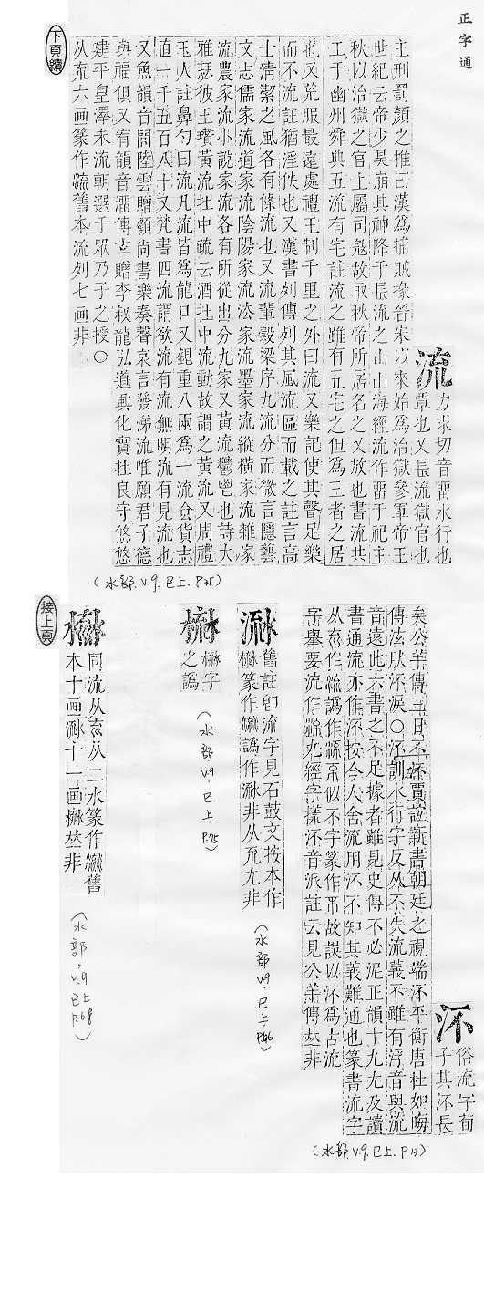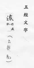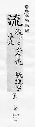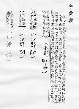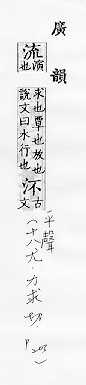 液体移动:~水。~汗。~血。~泪。~程。~泻。~质。~水不腐。汗~浃背。随波逐~(随着波浪起伏,跟着流水漂荡,喻没有主见,随着潮流走)。 像水那样流动不定:~转(zhuǎn )。~通。~寇。~浪。~离。~散。~失。~沙。~露。~萤。 传播:~言。~传。~芳。~弊。~毒。~行(xíng )。 指江河的流水:河~。江~。溪~。激~。奔~。 像水流的东西:气~。暖~。电~。 向坏的方面转变:~于形式。 旧时的刑罚,把犯人送到荒远的地方去:~放。~配。 品类,等级:~辈。~派。 指不正派:二~子。