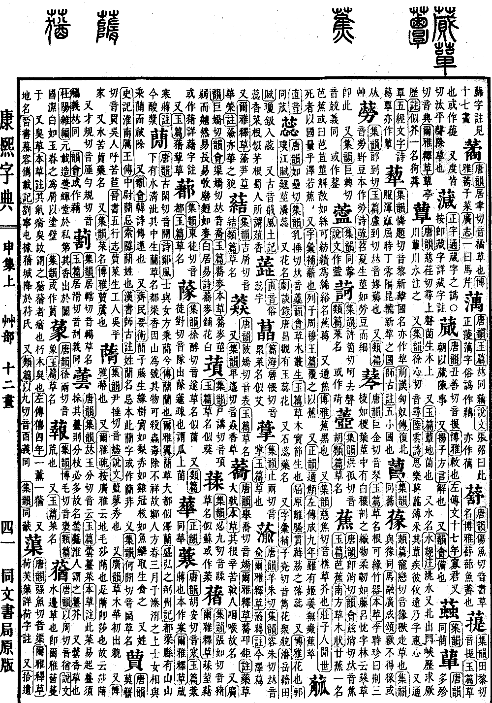 《唐韵》即消切《韵会》兹消切,𠀤音焦。《玉篇》芭蕉。《南方草木状》甘蕉,一名芭蕉,或曰芭苴。茎解散如丝,可纺绩,为𫄨绤,名蕉葛。 又通焦。《博雅》蕉,黑也。 又《集韵》慈焦切,音樵。草芥也。《庄子·人闲世》死者以国量乎泽若蕉。 又《字汇补》薪也。《列子·周穆王篇》覆之以蕉。 又《正韵》通顦。《左传·成九年》虽有姬姜,无弃蕉萃。