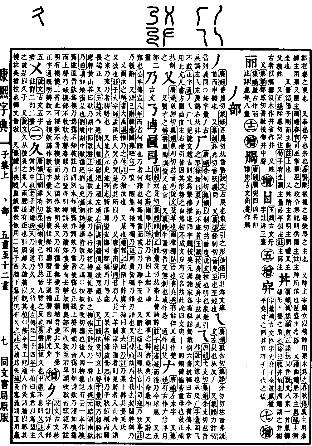 《唐韵》《正韵》举有切《集韵》《韵会》已有切,𠀤音九。暂之反也。《易·系辞》恒久也。《中庸》不息则久。《注》久,常于中也。《老子·道德经》天乃道,道乃久。 又待也。《左传·昭二十四年》士伯曰:寡君以为盟主之故,是以久子。 又《说文》久,从后灸之,象人两胫,后有距也。引周礼,久诸墙以观其桡。◎按今《考工记·庐人》作灸,诸墙以眡其桡。注灸,犹柱也。释文音救。 又《仪礼·士丧礼》夏祝鬻余饭用二鬲,于西墙不羃用疏布久之。《注》久读为灸。《疏》灸,塞义,谓直用麤布盖鬲口为塞也。 又《韵补》叶举里切,音几。《诗·邶风》何其久也,必有以也。久叶以。《小雅》来归自镐,我行永久。叶喜祉。《楚辞·招䰟》层冰峩峩,飞雪千里。归来归来,不可以久。