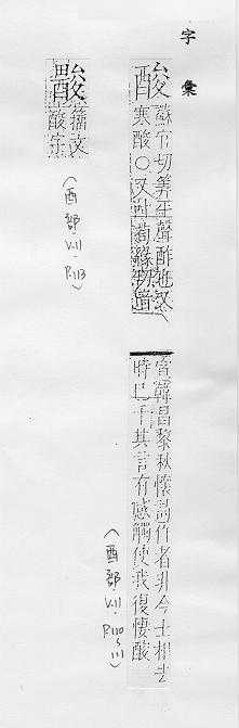 像醋的气味或味道:~菜。~溜溜。~梅。~甜。~奶。~枣。 化学上称能在水溶液中产生氢离子的化合物,分“无机酸”、“有机酸”两大类:盐~。碳~。硝~。硫~。~碱度。 讥讽人的迂腐:穷~。寒~。 悲痛,伤心:~楚。辛~(亦作“酸辛”)。~苦。~怆。~怀。 因疲劳或疾病引起的微痛而无力的感觉:~痛。腰~腿疼。
