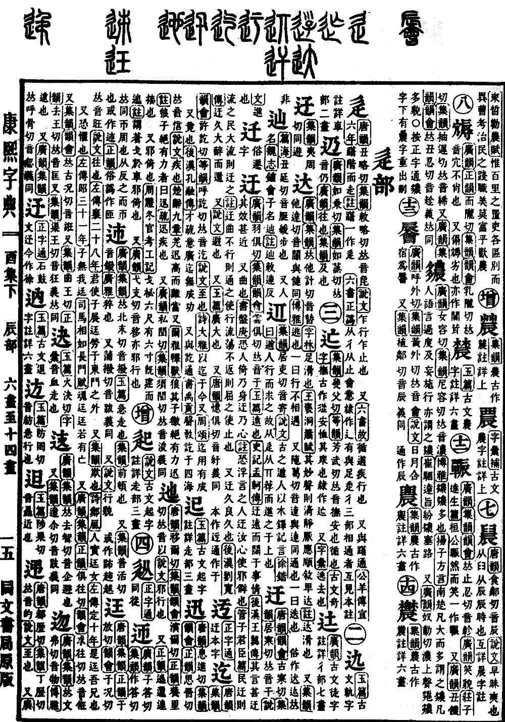 《唐韵》《集韵》《韵会》许讫切《等韵》呼讫切,𠀤音汔。《说文》至也。《诗·大雅》以迄于今。又《周颂》迄用有成。 又竟也。《后汉·孔融传》才疏意广,迄无成功。 又与讫通。《书·禹贡》声敎讫于四海。