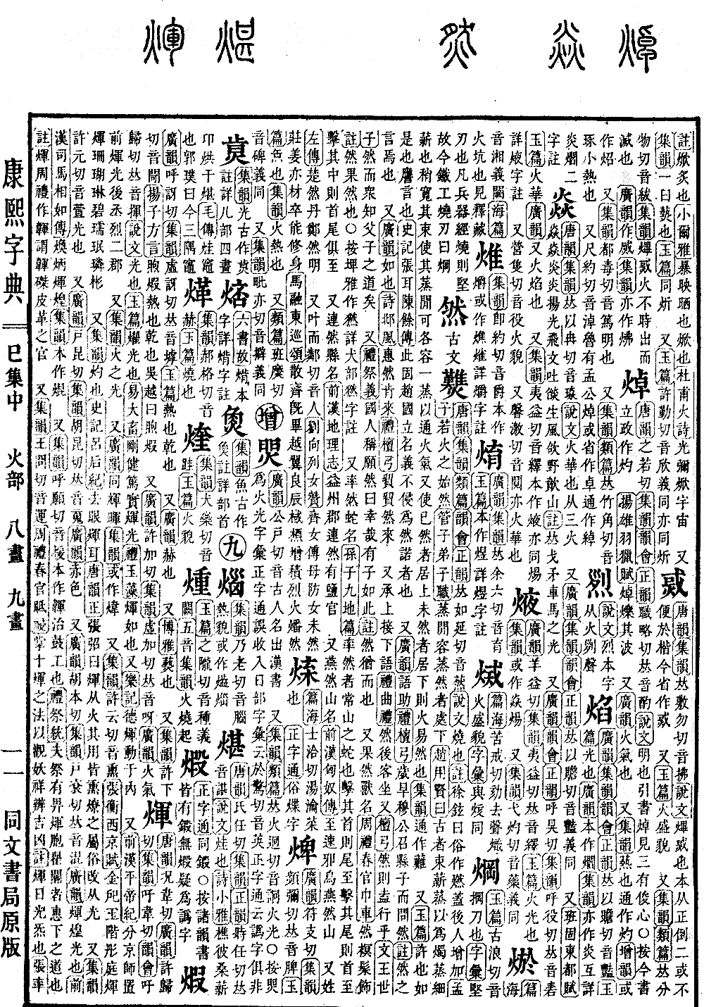 〔古文〕𤓉《唐韵》《集韵》《类篇》《韵会》《正韵》𠀤如延切,音䔳。《说文》烧也。《注》徐铉曰俗作燃。盖后人增加。《孟子》若火之始然。《管子·弟子职》蒸闲容蒸,然者处下。《文刘绩曰》古者,束薪蒸以为烛。蒸,细薪也。稍宽其束,使其蒸闲可各容一蒸,以通火气。又使已然者居下,未然者居上,则火易然也。《集韵》通作䕼。 又《玉篇》许也,如是也。譍言也。《史记·张耳陈余传》此固赵国立名义不侵为然诺者也。 又《广韵》语助。《礼·檀弓》岁旱,穆公召县子而问然。《注》然之言焉也。 又《广韵》如也。《诗·邶风》惠然肯来。《礼·檀弓》贸贸然来。 又承上接下语。《礼·曲礼》然后客坐。又《檀弓》然则盍行乎。《文王世子》然而众知父子之道矣。 又《礼·祭义》国人称愿,然曰:幸哉有子如此。《注》然犹而也。 又果然,兽名。《周礼·春官·巾车》然。𧜀髤饰。《注》然,果然也。◎按埤雅作𤡮。详犬部𤡮字注。 又率然,蛇名。《孙子·九地篇》率然者,常山之蛇也。击其首,则尾至。击其尾,则首至。击其中,则首尾俱至。 又连然,县名。《前汉·地理志》益州郡连然有盐官。 又燕然,山名。《前汉·匈奴传》至速邪乌燕然山。 又姓。《左传》楚然丹。郑然明。 又叶而邻切,音人。《刘向·列女赞》齐女傅母,防女未然,庄姜亦材,卒能脩身。《马融·东巡颂》散齐即毕,越翼良辰,棫槱增积,烈火燔然。*考证:〔《管子·弟子职》蒸闲容蒸,然者处下。《赵用贤曰》古者,束薪蒸以为烛。蒸,细薪也。稍宽其束,使其蒸闲可各容一蒸,以通火气。又使已然者居上,未然者居下,则火易然也。〕 谨按管子卷首有按字者,皆刘绩语,非赵用贤语。谨据凡例将赵用贤曰四字改为文刘绩曰。按又已然者居上二句系释然者居下之义,盖火性炎上故使已然者居下,未然者居上,则火易然也。谨按文义将已然句上字改为下字。未然句下字改为上字。