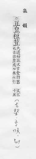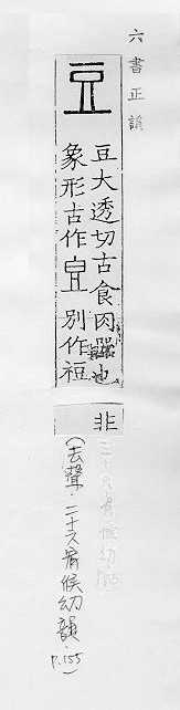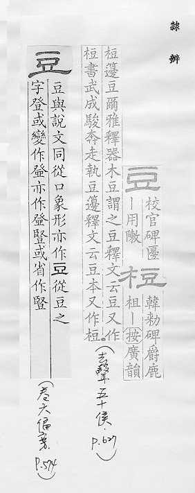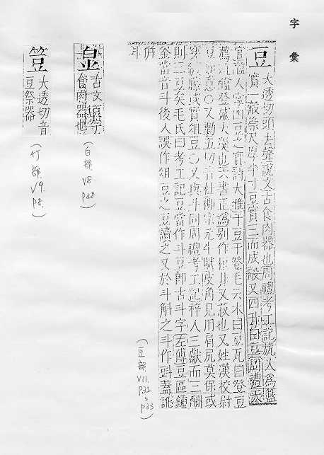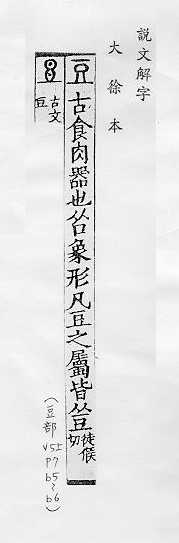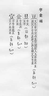 双子叶植物的一科,木本、草本植物都有,如“紫檀”、“槐树”、“黄豆”、“绿豆”、“红豆”、“豌豆”、“落花生”等,日常统称豆类植物,亦指这些植物的种子:~科。~子。~荚(豆角儿)。~浆。~绿。煮~燃萁。目光如~。 形状像豆粒的东西:土~儿。 古代盛肉或其他食品的器皿,形状像高脚盘:俎~。 姓。