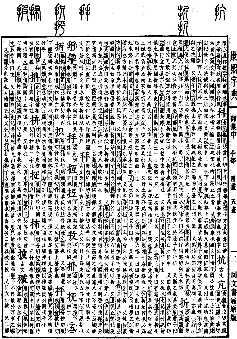 〔古文〕翍《唐韵》敷羁切《集韵》《韵会》攀糜切,𠀤音铍。《说文》从旁持曰披。 又《广韵》开也。《史记·帝舜纪》披九山,通九泽。《前汉·邹阳传》披心腹,见情素。《韩愈·进学解》手不停披于百家之编。 又《增韵》分也,散也。《左传·昭五年》又披其邑。《注》析也。《扬子·方言》厮披,散也。东齐声破曰厮,器破曰披。 又荷衣曰披。 又《正韵》篇夷切,音纰。义同。 又《唐韵》《广韵》匹靡切《集韵》《韵会》普靡切,𠀤音㱟。裂也。《史记·范睢传》木实繁者披其枝。又《灌夫传》枝大于本,胫大于股,不折必披。《注》披,分拆也。疋彼反。 又披靡,震伏貌。《前汉·项籍传》羽大呼驰下,汉军皆披靡。 又《正韵》普弭切,音庀。义同。 又《集韵》《类篇》《韵会》𠀤彼义切,音贲。《礼·檀弓》孔子之丧设披。《注》披,柩行夹引棺者。《疏》设之于旁,所以备倾亏也。《周礼·夏官·司士》作六军之士执披。《疏》披者,车两旁使人持之,若四马六辔然。 又《正韵》兵媚切,音祕。义同。 又《集韵》平义切,音被。亦散也。 又《正韵》普驾切,音怕。亦开也。 又叶普禾切,音坡。《刘邵·赵都赋》布濩中林,缘延陵阿。从风发曜,倚靡云披。