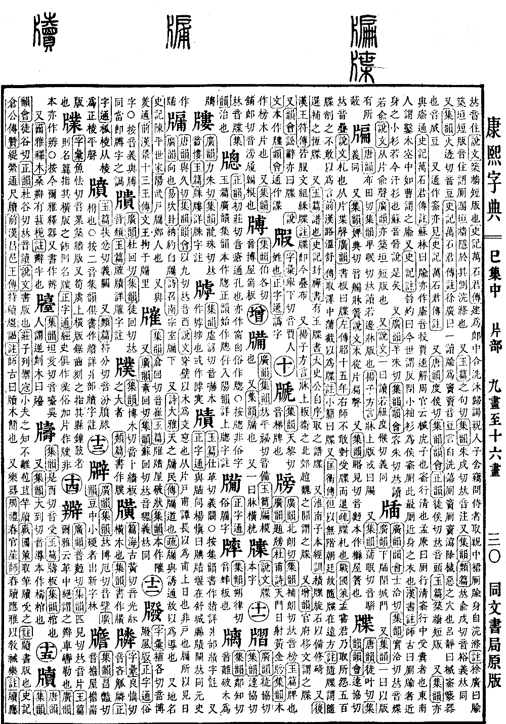 《唐韵》徒叶切《集韵》《韵会》达协切,𠀤音叠。《说文》札也。从片,枼声。《广韵》书板曰牒。《左传·昭十五年》右师不敢对,受牒而退。《疏》牒,札也。《战国策》孟尝君乃取所怨五百牒削之,不敢以为言。《前汉·路温舒传》取泽中蒲,截以为牒。《注》小简曰牒。又《匡衡传》但以无阶朝廷故随牒在远方。《注》随牒,谓随选补之恒牒。 又《玉篇》谱也。《史记·封禅书》有玉牒书。《太史公自序》取之谱牒。 又《淮南子·本经训》积牒旋石以备修埼。 又《后汉·王符传》皆服文组彩牒。《注》牒即今叠布。 又《扬子·方言》牀上板。衞之北郊,赵魏之闲谓之牒。 又《增韵》官府移文谓之牒。又《韵会》讼辞亦曰牒。 《说文》本作𤗣。《韵会》通作谍。