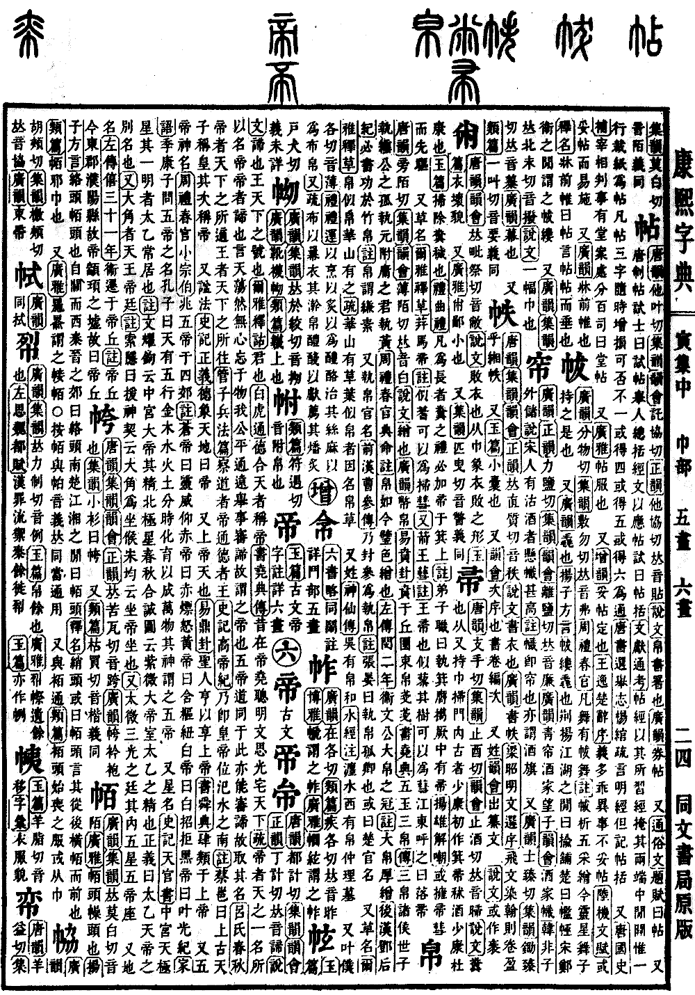 《广韵》《正韵》力盐切《集韵》《韵会》离盐切,𠀤音廉。《广韵》靑帘,酒家望子。《韵会》酒家帜。《韩非子·外储说》宋人有沽酒者,悬帜甚高。《注》帜,即帘也。亦谓酒旗。 又《广韵》士臻切《集韵》锄臻切,𠀤音蓁。《广韵》幕也。 又《类篇》一叫切,音要。义同。*(帘)《广韵》《正韵》力盐切《集韵》《韵会》离盐切,𠀤音廉。编竹作帏簿也。《释名》帘,廉也,自障蔽为廉耻也。《礼纬》天子外屛,诸侯内屛,大夫以帘,士以帷。《前汉·王贡传序》严君平卜筮于成都市,裁日阅数人,得百钱,足自养,则闭肆下帘。而授《老子》。 又《韵会》箨名。