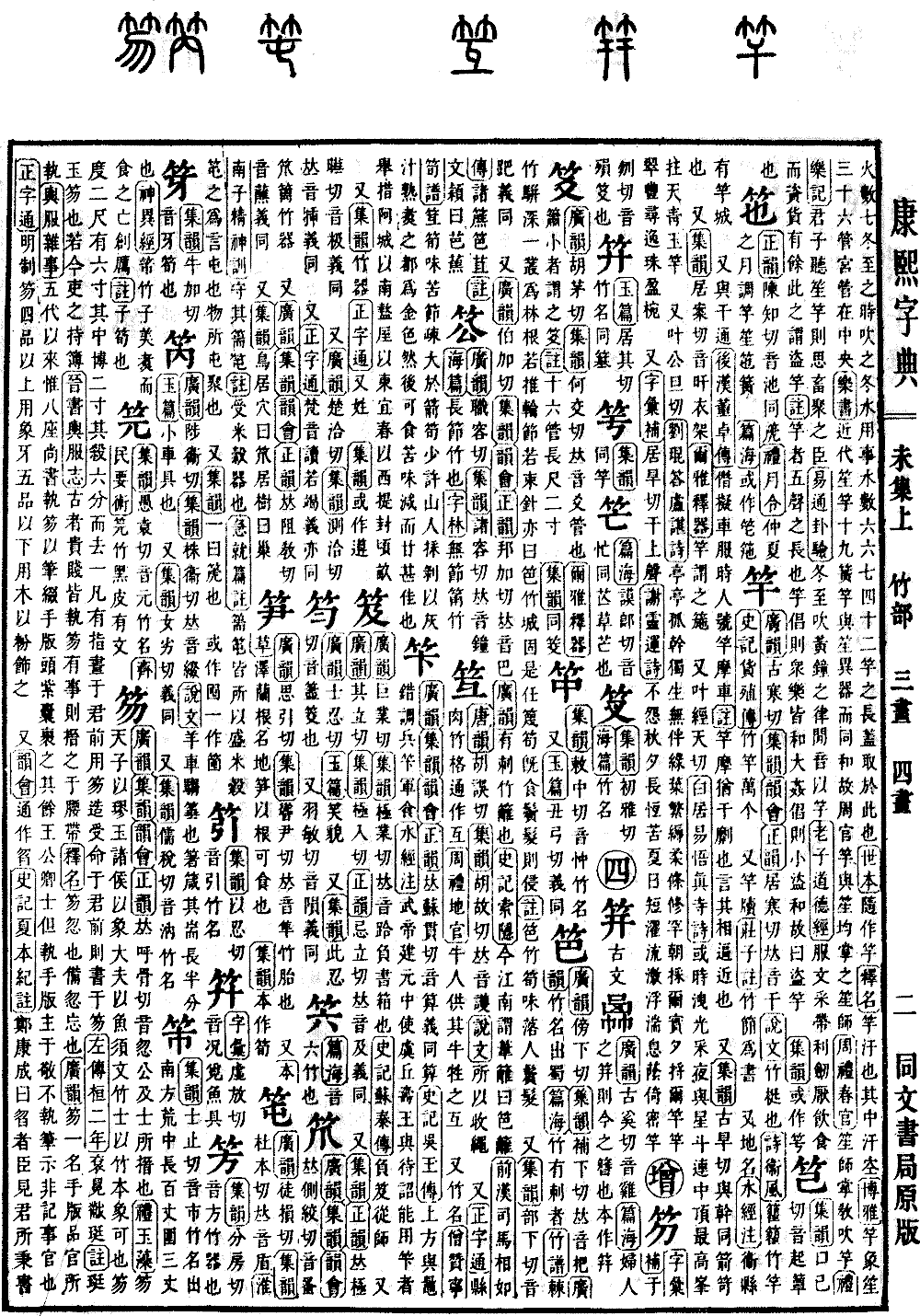 《广韵》思引切《集韵》耸尹切,𠀤音隼。竹胎也。 又《本草》泽兰,根名地笋,以根可食也。 《集韵》本作笋。*(笋)〔古文〕𥳦𥰴《广韵》思引切《集韵》耸尹切《正韵》耸允切,𠀤音簨。《说文》竹胎也。《尔雅·释草》笋,竹萌。《疏》竹初萌生谓之笋。《诗·大雅》其䔩维何,维笋及蒲。《陆玑疏》笋皆四月生,惟巴竹笋八月、九月生。始出地,长数寸,鬻以苦酒、䜴汁浸之,可以就酒及食。《唐书·百官志》司竹监掌植竹、苇,岁以笋供尚食。《本草》竹有雌雄,雌者多笋,于竹根行鞭时,掘取嫩者,谓之鞭笋。冬月掘大竹根下未出土者为冬笋,𠀤可鲜食,为珍品。南人淡干者为玉版笋、明笋、火笋,盐曝者为盐笋,𠀤可为蔬食。诸竹笋气味甘,微寒,无毒。 又县钟磬之横木曰笋,与簨同。《周礼·冬官考工记》梓人为笋虡。《注》乐器所悬横曰笋,直曰虡。《疏》笋读为竹笋之笋。 又《类篇》于伦切。弱竹,可为席。《书·顾命》敷重笋席。《传》笋,蒻竹。徐云:竹子竹为席。 又《集韵》《韵会》《正韵》𠀤须闰切,音峻。竹舆也。《公羊传·文十五年》齐人归公孙敖之丧,胁物而归之,笋将而来也。《注》笋者,竹箯。一名编舆,齐、鲁以北名之曰笋。 《集韵》笋或作箰,俗作笋。簨字原从竹从巺作。
