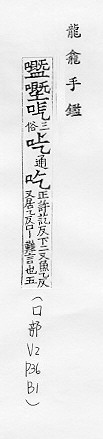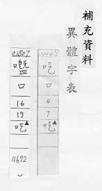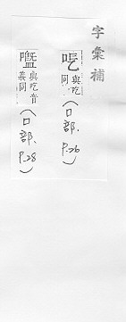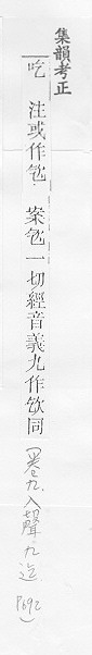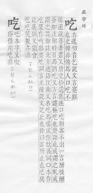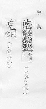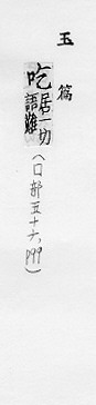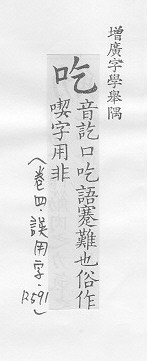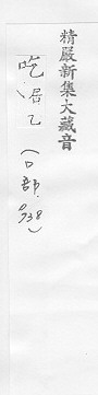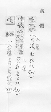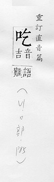 把东西送进口中咽下,或依靠某种事物生活:~饭。~药。~斋。 消灭(多用于军事、棋奕):~掉敌人一个连。 吸:~烟。 感受:~惊。~紧。~一堑,长(zhǎng )一智。 挨:~官司。 承受,支持:~不消。 船身入水的深度:~水深浅。 被:~那厮砍了一刀。 说话结巴:口~。