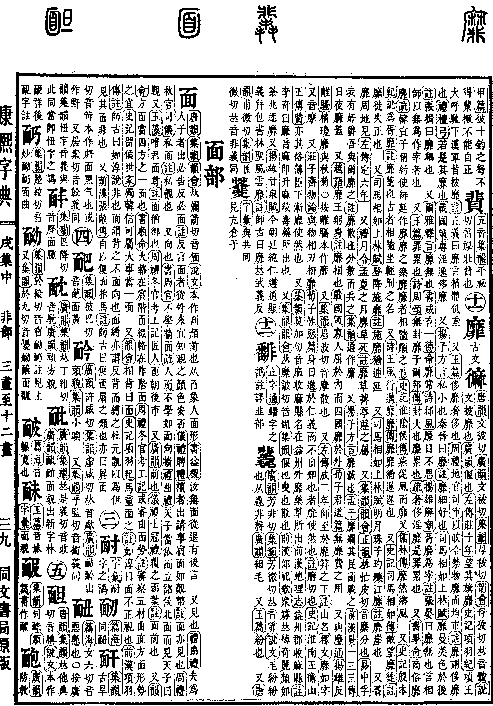 《唐韵》《集韵》《韵会》𠀤弥箭切,音偭。《说文》本作𠚑,颜前也。从𦣻,象人面形。《书·益稷》汝无面从,退有后言。 又见也。《礼·曲礼》夫为人子者,出必告,反必面。《注》反言面者,从外来,宜知亲之颜色安否。《仪礼·聘礼》𢷤者出请事,賔面如觌币。《注》面,亦见也。《周礼·秋官·司仪》私面。《注》私觌也。 又向也。《书·周官》不学墙面。《疏》人而不学,如面向墙。《礼·曲礼》天子当依而立,诸侯北面而见天子,曰觐。又《玉藻》唯君面尊。《注》面,犹鄕也。《周礼·冬官考工记·匠人》面朝后市。 又《广韵》前也。《仪礼·士冠礼》覆之面叶。《注》面,前也。 又《韵会》方面,当四方之一面也。《书·顾命》大辂在賔阶面,缀辂在阼阶面。《周礼·冬官考工记》或审曲面势。《注》审察五材曲直方面形势之宜。《史记·留侯世家》独韩信可属大事,当一面。 又《韵会》相背曰面。《史记·项羽纪》马童面之。《注》如淳曰:面,不正视也。《前汉·项羽传注》师古曰:如淳说非也。面谓背之,不面向也。面缚亦谓反背而缚之,杜元凯以为但见其面,非也。 又《前汉·张敞传》自以便面拊马。《注》师古曰:便面,扇之类也。亦曰屛面。*考证:〔《说文》本作𠚑,颜前也。从自〕 谨照原文自改𦣻。