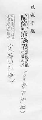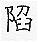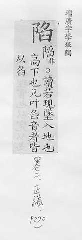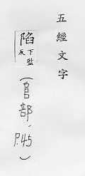 掉进,坠入,沉下:~落。~没(mò)。~溺。~于。~入。 为捉野兽挖的坑:~坑。~阱。 凹进:双眼深~。 设计害人:~害。诬~。~人于罪。 攻破,占领:失~。沦~。 缺点:缺~。