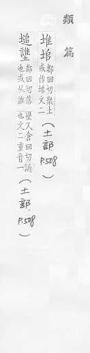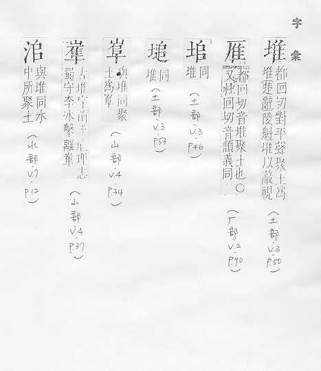 累积在一起的东西:~栈。~房。土~。 累积在一起,聚积在一起:~积。~放。~垒。~摞。~砌。 量词,用于成堆的物或成群的人:一~人。