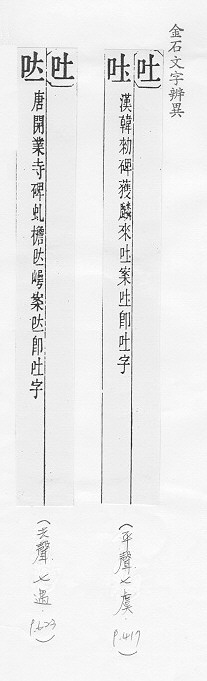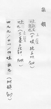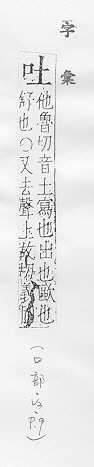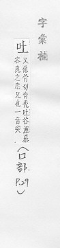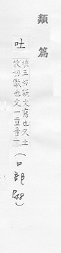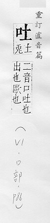 使东西从口里出来:~痰。吞~。~刚茹柔(吐出硬的,吃下软的;喻欺软怕硬)。 放出,露出:高粱~穗。~故纳新。 说出:~话。一~为快。