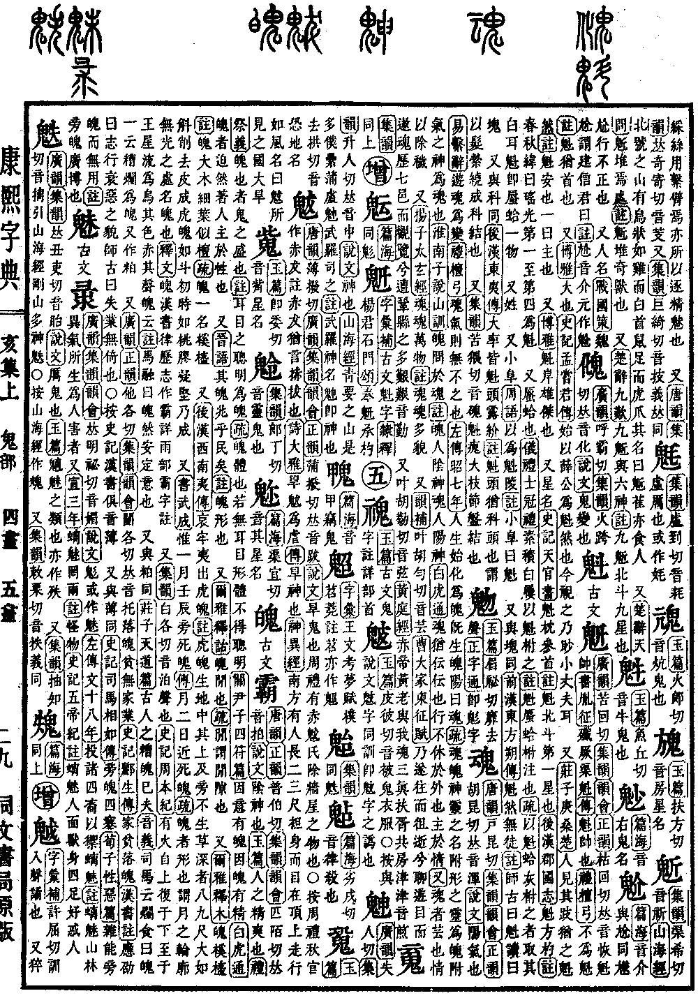 〔古文〕霸《唐韵》《正韵》普伯切《集韵》《韵会》匹陌切,𠀤音拍。《说文》隂神也。《玉篇》人之精爽也。《礼·祭义》魄也者,鬼之盛也。《注》耳目之聪明为魄。《疏》魄,体也。若无耳目,形体不得聪明。《关尹子·四符篇》因意有魄,因魄有精。《白虎通》魄者,迫然着人,主于性也。 又《晋语》其魄兆乎民矣。《注》魄,形也。 又《尔雅·释诂》魄,闲也。《疏》闲谓闲隙也。 又《尔雅·释木》魄,榽橀。《注》魄,大木,细叶,似檀。《疏》魄,一名榽橀。 又《后汉·西南夷传》哀牢夷出虎魄。《注》虎魄生地中,其上及旁不生草,深者八九尺,大如斛,削去皮成虎魄,如斗。初时如桃胶,凝坚乃成。 又《书·武成》惟一月壬辰,旁死魄。《传》月二日近死魄。《疏》魄者,形也。谓月之轮廓无光之处名魄也。《释文》魄,汉书律历志作霸。详雨部霸字注。 又《集韵》白各切,音泊。声也。《史记·周本纪》有火自上复于下,至于王屋,流为乌,其色赤,其声魄云。《注》马融曰:魄然,安定意也。 又与粕同。《庄子·天道篇》古人之糟魄已夫。《音义》司马云:烂食曰魄。一云糟烂为魄。又作粕。 又《广韵》《正韵》他各切《集韵》《韵会》闼各切,𠀤音托。落魄,贫无家业。《史记·郦生传》家贫落魄。《汉书注》应劭曰:志行衰恶之貌。师古曰:失业无倚也。○按《史记》《汉书》俱音薄。 又与薄同。《史记·司马相如传》旁魄四塞。《荀子·性恶篇》杂能旁魄而无用。《注》旁魄,广博也。