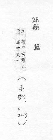 生物在生态和形态上具有不同特点的分类的基本单位:物~。~差(chā), 植物果实中能长成新植物的部分,又泛指生物传代繁殖的物质:~子。~禽。~畜。撒~。配~。 具有共同起源和共同遗传特征的人群:人~。~族。 量词,表示类别、式样:~~。两~人。 指胆量或骨气:有~。没~。