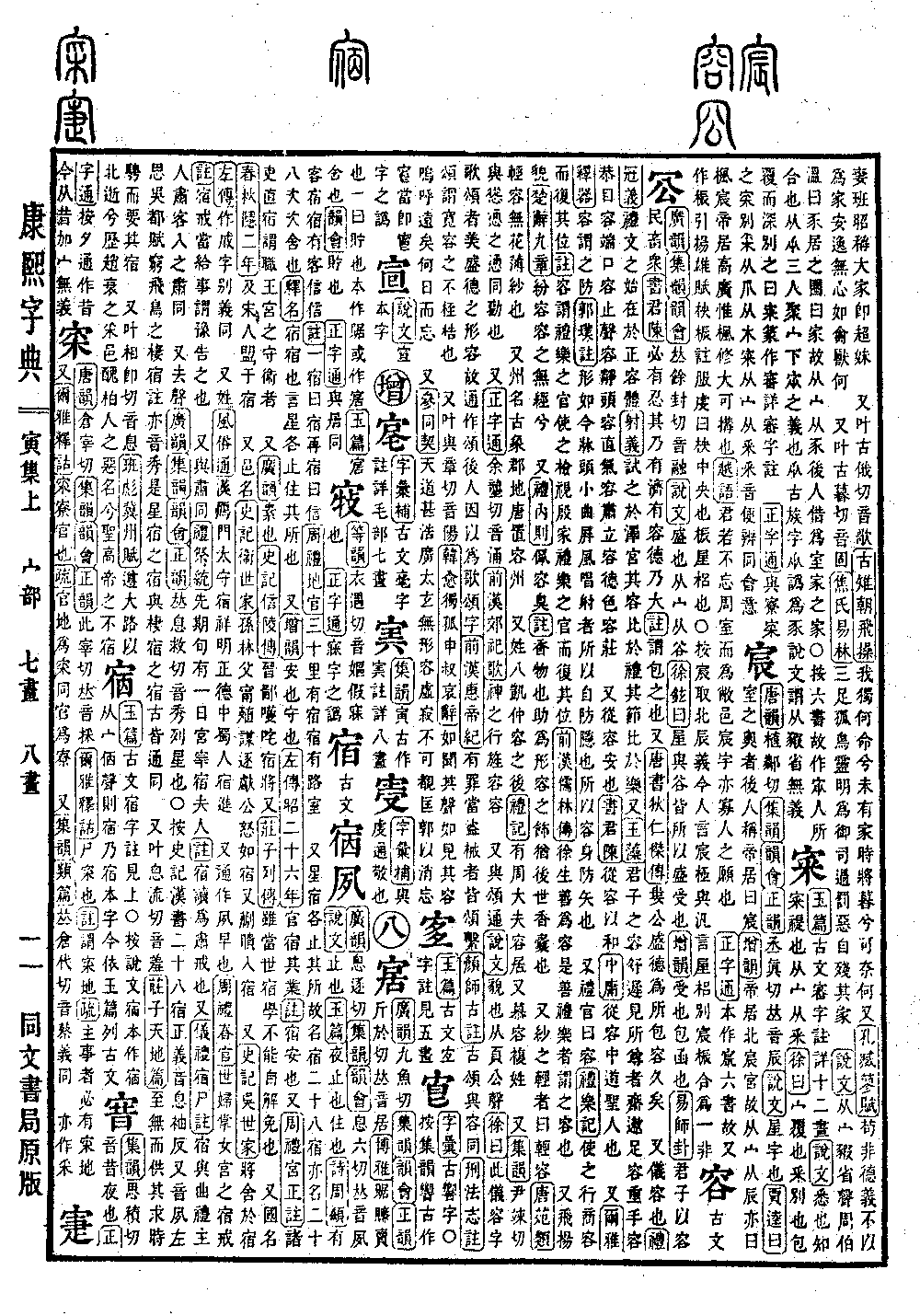 〔古文〕㝛夙《广韵》息逐切《集韵》《韵会》息六切,𠀤音夙。《说文》止也。《玉篇》夜止也,住也。《诗·周颂》有客宿宿,有客信信。《注》一宿曰宿,再宿曰信。《周礼·地官》三十里有宿,宿有路室。 又星宿各止其所,故名宿。二十八宿,亦名二十八次。次,舍也。《释名》宿,宿也,言星各止住其所也。 又《增韵》安也,守也。《左传·昭二十九年》官宿其业。《注》宿,安也。又《周礼·宫正注》诸吏直宿,谓职王宫之守衞者。 又《广韵》素也。《史记·信陵传》晋鄙嚄咤宿将。又《庄子·列传》虽当世宿学,不能自解免也。 又国名。《春秋·隐二年》及宋人盟于宿。 又邑名。《史记·衞世家》孙林父宁殖,谋逐献公怒如宿。又蒯瞆入宿。 又《史记·吴世家》将舍于宿。《左传》作戚,字别义同。 又姓。《风俗通》汉鴈门太守宿祥,明正德中蜀人宿进。 又通作夙,早也。《周礼·春官》世妇,掌女宫之宿戒。《注》宿戒,当给事,谓豫告之也。 又与肃同。《礼·祭统》先期旬有一日,宫宰宿夫人。《注》宿读为肃戒也。又《仪礼·宿尸注》宿,与曲礼主人肃客入之肃同。 又去声。《广韵》《集韵》《韵会》《正韵》𠀤息救切,音秀。列星也。◎按《史记》《汉书》二十八宿。《正义》音息袖反,又音夙。《左思·吴都赋》穷飞鸟之栖宿,注亦音秀,是星宿之宿,与栖宿之宿,古皆通同。 又叶息流切,音羞。《庄子·天地篇》至无而供其求,时骋而要其宿。 又叶相即切,音息。《班彪·冀州赋》遵大路以北逝兮,历赵衰之采邑。丑柏人之恶名兮,圣高帝之不宿。*考证:〔《左传·昭二十六年》官宿其业。〕 谨照原文二十六年改二十九年。
