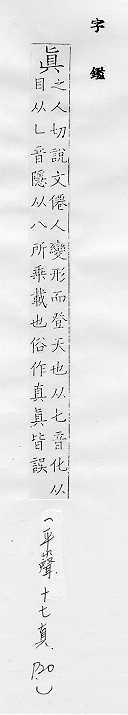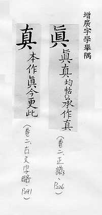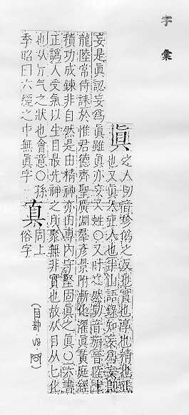 与客观事实相符合,与假、伪相对:~诚。~谛。~挚。~心。逼~。认~。~才实学。~知灼见。 确实,的确:~好。~正。~切。 清楚,显明:看得~。咬字很~。 本性,本原:纯~。天~。 人的肖像:传(chuán )~。写~。 汉字的楷书:~字。~书。~草隶篆。 姓。
