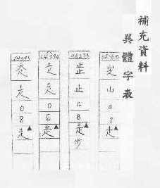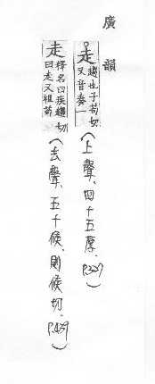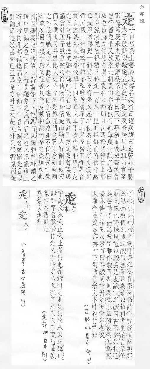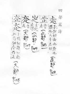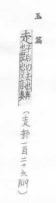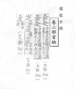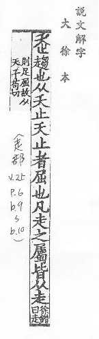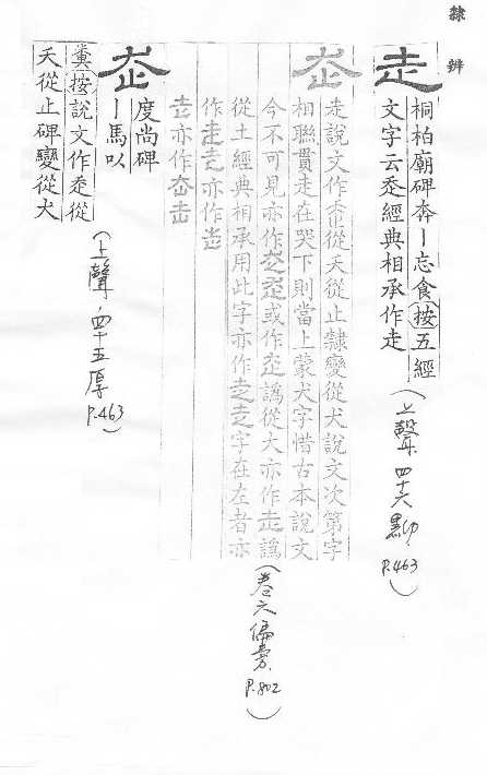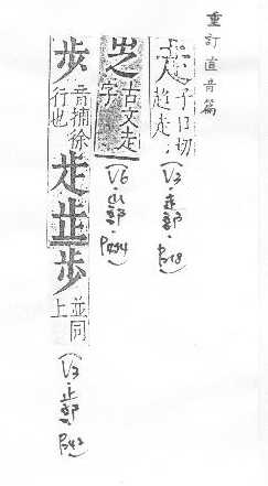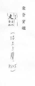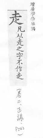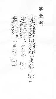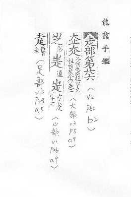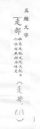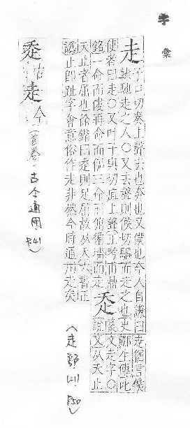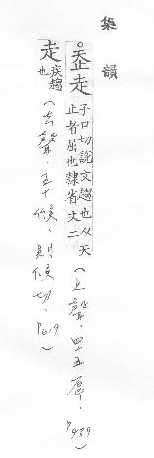 行:~路。~步。 往来:~亲戚。 移动:~向(延伸的方向)。~笔(很快地写)。钟表不~了。 往来运送:~信。~私。 离去:~开。刚~。出~。 经过:~账。~内线。~后门。 透漏出去,超越范围:~气(漏气)。 失去原样:~形。~样。 古代指奔跑:~马。不胫而~。 仆人,我的谦辞:牛马~(当牛作马的仆人,如“太史公~~~。”)。