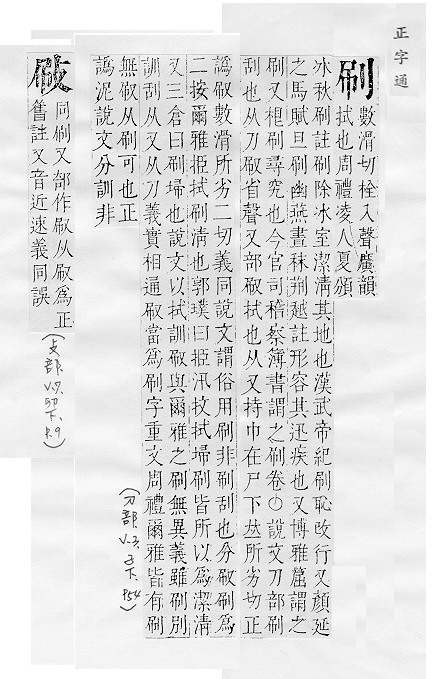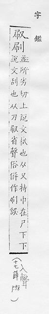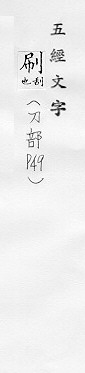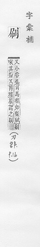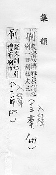 用成束的毛棕等制成的清除或涂抹的用具:~子。毛~。板~。 擦拭,涂抹,清洗:~牙。~墙。~洗。印~。~耻(洗雪耻辱)。 剔除,淘汰:~选(剔除)。~掉。