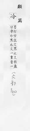 温度低,与热相对:~天。~藏。~冻。~涩。~飕飕。 寂静,不热闹:~落。~寂。~静。~清。 生僻,少见的:~僻。~字。 不热情,不温和:~遇。~淡。~峻。~漠。~嘲热讽。~若冰霜。~酷无情。 不受欢迎的,没有人过问的:~货。~门儿。 突然,意料以外的:~然。~不防。~枪。~战。 姓。