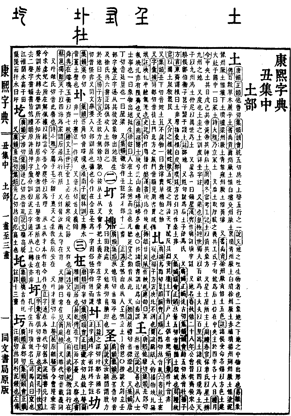 《唐韵》《正韵》他鲁切《集韵》《韵会》统五切,𠀤吐上声。五行之一。《说文》地之吐生物者也。二象地之下,地之中,丨物出形也。《易·离彖传》百谷草木丽乎土。《书·禹贡》冀州厥土惟白壤,兖州厥土黑坟,靑州厥土白坟,徐州厥土赤埴坟,扬州荆州厥土惟涂泥,豫州厥土惟壤下土坟垆,梁州厥土靑黎,雍州厥土惟黄壤。 又《书·禹贡》徐州厥贡惟土五色。《注》诸侯受命,各锡以方色土,建大社于国中,一曰冢土。《诗·大雅》乃立冢土。 又后土,取厚载之义。共工氏子句龙为后土,位在中央,主于四季各十八日。《礼·月令》中央土,其日戊己,其帝黄帝,其神后土。《周礼·冬官考工记》土以黄,其象方。 又星土,星所主土。《周礼·春官》保章氏以星土辨九州之地。 又度也。土圭之土训度。详圭字注。 又业也。《皇极经世》独夫以百亩为土,大夫以百里为土,诸侯以四境为土,天子以九州为土,仲尼以万世为土。 又星名,一曰镇星。《汉书》作塡。详塡字注。 又地名。《春秋·僖二十八年》公会晋侯,齐侯,宋公,蔡侯,郑伯,衞子,莒子,盟于践土。《注》郑地。 又姓。句龙为后土,子孙为氏。 又《广韵》《正韵》徒古切《集韵》《韵会》动五切,𠀤音杜。《扬子·方言》东齐谓根曰土,非专指桑根白皮。《郭璞注》《方言》引《诗》作桑土,非。 又《集韵》《韵会》《正韵》𠀤董五切,音覩。圜土,狱城也。《周礼·秋官》以圜土聚敎罢民。 又《介之推龙蛇歌》五蛇从之,周流天下。龙反其渊,安其壤土。下音戸,尸土俱在姥韵。《字汇》作叶音,非。又《集韵》丑下切,音姹。土苴,不真物。一曰查滓,粪草糟粕之类。又《字汇补》同都切,音徒。土门,北方之族。门音瞒。见周书异域传。*考证:〔《说文》地之吐生物者也。二象地之下,地之中,物出形也。〕 谨照原文物出上增土字。