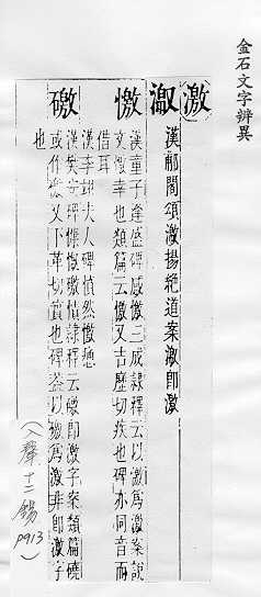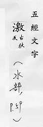 水受阻遏,震荡而涌或飞溅:冲~。~荡。~浊扬清(冲击污水,让清水上来,喻打击坏人坏事,奖励好人好事)。 冷水突然浇淋或冲、泡食物:~酸菜。 鼓动,使人的感情冲动:刺~。~励。 感情冲动:感~。~动。~昂慷慨。 急剧的,强烈的:~烈。~进。 过分直率:~厉。~切。 〔~光〕某些物质的原子中的粒子受光或电刺激,使低能级的原子变成高能级原子,而辐射出相位、频率、方向等完全相同的光,称“激光”。亦称“莱塞”、“镭射”。 〔~光器〕产生激光的装置。 〔~素〕内分泌腺分泌的物质。亦称“荷尔蒙”。 鲜明:唇如~丹。