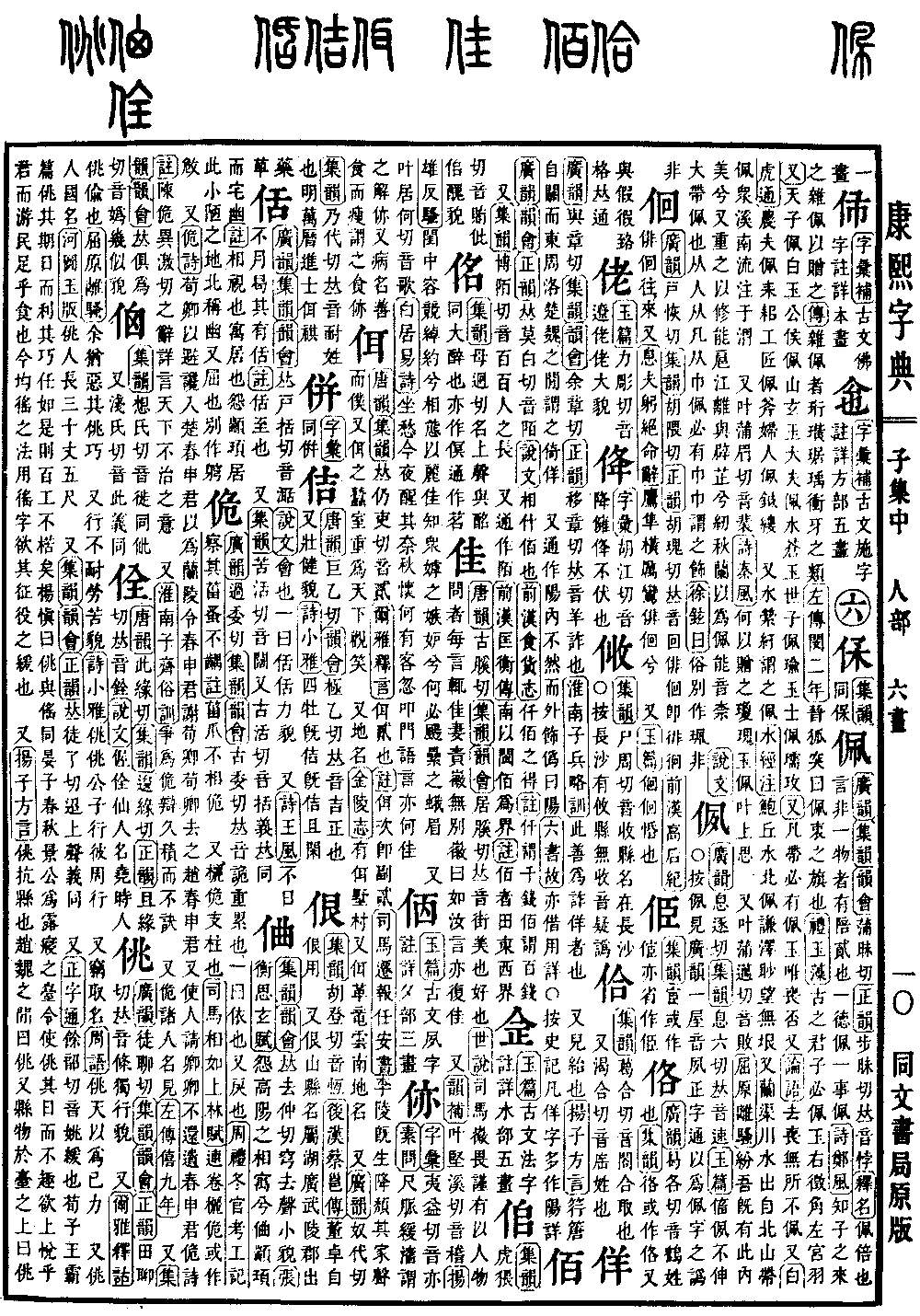 《广韵》《集韵》《韵会》蒲昧切《正韵》步昧切,𠀤音悖。《释名》佩,倍也。言其非一物,有陪贰也。一德佩,一事佩。《诗·郑风》知子之来之,杂佩以赠之。《传》杂佩者,珩璜琚瑀冲牙之类。《左传·闵二年》晋狐突曰:佩衷之旗也。《礼·玉藻》古之君子必佩玉,右征角,左宫羽。《又》天子佩白玉,公侯佩山𤣥玉,大夫佩水苍玉,世子佩瑜玉,士佩瓀玫。《又》凡带必有佩玉,唯丧否。又《论语》去丧无所不佩。又《白虎通》农夫佩耒耜,工匠佩斧,妇人佩鍼缕。 又水萦纡谓之佩。《水经注》鲍丘水北佩谦泽,眇望无垠。又兰渠川水出自北山,带佩众溪南流注于渭。 又叶蒲眉切,音裴。《诗·秦风》何以赠之,琼瑰玉佩。叶上思。 又叶蒲迈切,音败。《屈原·离骚》纷吾既有此内美兮,又重之以修能。扈江离与辟芷兮,纫秋兰以为佩。能音柰。 《说文》大带佩也。从人从凡从巾。佩必有巾,巾谓之饰。《徐铉曰》俗别作珮,非。*考证:〔《释名》佩,倍也。言非一物者,有陪贰也。〕 谨照原文言非一物者改言其非一物。