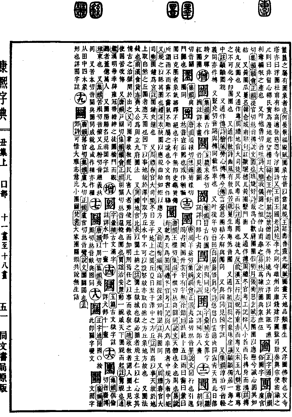 《唐韵》王权切。《集韵》于权切。𠀤与圆同。《说文》天体也,全也,周也。《易·说卦》干为天,为圜。《周礼·冬官考工记》舆人为车,圜者中规,方者中矩。《又》规之以眡其圜也。《礼·深衣》袂圜以应规,曲袷如矩以应方。 又《前汉·梅福传》高祖从䛫如转圜。《注》与圆同。 又《周礼·春官·大司乐》圜钟,为宫。《注》圜钟,夹钟也。 又《周礼·春官·大司乐》冬日至,于地上之圜丘,夏日至,于泽中之方丘。《注》因高以事天,故于地上取自然之丘,圜者应天圜也。因下以事地,故于泽中取方丘,水中不可以设祭,故亦取自然之方丘,象地方故也。 又圜法,钱也。《前汉·食货志》齐太公为周立九府圜法。 又《周礼·地官·比长》以圜土纳之。《注》圜土,狱城也。狱必圜者,规主仁,以仁心求其情,古之治狱,闵于出之。《又》司圜掌收敎罢民,凡害人者,弗使冠饰,而加明𠛬焉,任之以事,而收敎之。《疏》收敎者,谓入圜土,见收使困苦攺悔。 又《唐韵》戸关切《集韵》《韵会》《正韵》胡关切,𠀤音还。绕也,围也。《贾谊·治安策》动一亲戚,天下圜视而起。《注》惊视也。《通鉴》汉明帝幸辟雍,冠带缙绅之徒圜桥门,而观听者盖亿万人。 又圜阳,县名。见前圁字注。