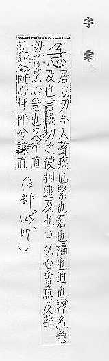 焦燥:~燥。着~。焦~。 气恼,发怒:~眼。 使着急:这件事真~人。 匆促:~促。~功近利(急于求目前的成效和利益)。 迅速,又快又猛:~流。~进。~先锋。~风暴雨。 迫切,要紧:~切。~诊。~事。 严重:告~。 对大家的事情或别人的困难尽快帮助:~人之难。