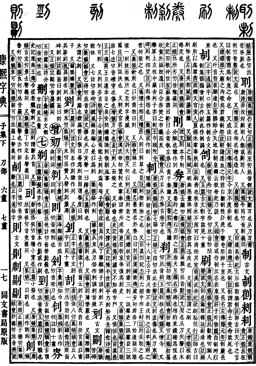 〔古文〕𠜔𠝦𠝁𠛐《唐韵》《集韵》《韵会》《正韵》𠀤征例切,音制。《说文》裁也。又《增韵》正也,御也,检也,造也。又《广韵》禁制也。又《前汉·高帝纪》太后临朝称制。《注》师古曰:天子之言曰制书,谓为制度之命也。又成法曰制。《左传·隐元年》今京不度,非制也。又《礼·曲礼》士死制。《注》制谓君命,士受命致死也。又《礼·礼器》大庙之内敬矣,君亲制祭。《注》朝践进血之时,君自断制牲肝,洗于郁鬯,祭神于室也。又邑名。《左传·隐元年》制,岩邑也。又叶音哲。《崔骃·达旨》隂阳始分,天地初制。皇纲云叙,帝纪乃设。又《韵会》浙或作制。江名,在东阳。《庄子·外物篇》自制河以东。