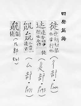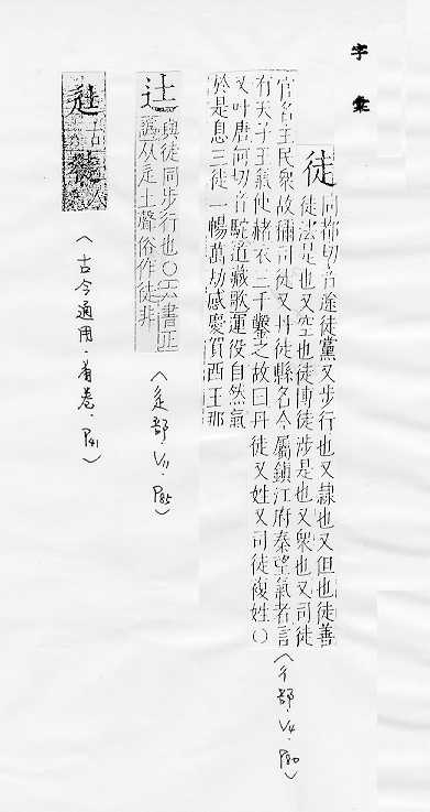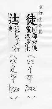 步行:~步。~涉。 空:~手。 白白地:~然。~劳无益。 只;仅仅:家~四壁。 从事学习的人:~弟。~工。学~。师~。 同一派系或信仰同一宗教的人:信~。教~。党~。 人(多指坏人):匪~。暴~。赌~。叛~。 剥夺犯人自由的刑法:~刑。