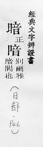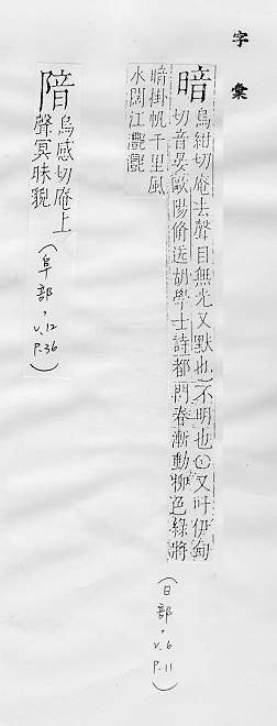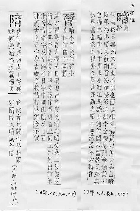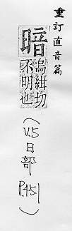 不亮,没有光,与明相对:黑~。~淡(a.不光明;b.喻景象悲惨)。阴~。~无天日。 不公开的,隐藏不露的:~藏。~号。~杀。~娼。~沟。~含(做事、说话包含某种意思而未明白说出)。~流(a.流动的地下水;b.喻潜伏的思想倾向或社会动态)。明察~访。 愚昧,糊涂:~昧。~弱(愚昧软弱)。兼听则明,偏信则~。