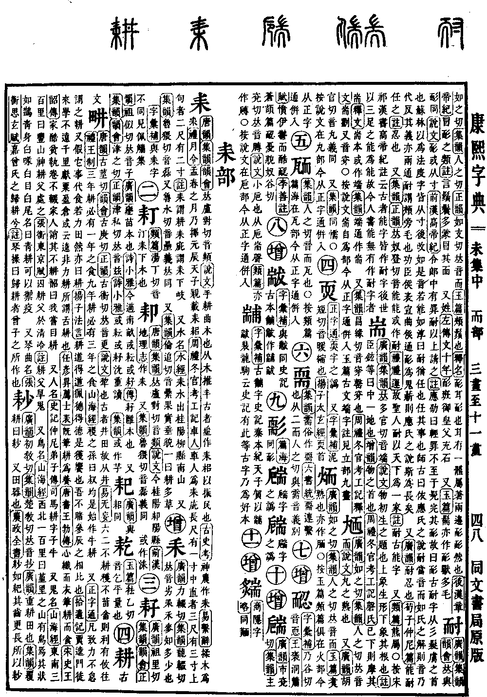 〔古文〕畊《唐韵》古茎切《韵会》古庚切《正韵》古衡切,𠀤音更。《说文》犂也。古者井田,故从井。《易·无妄》六二不耕获,不葘畬,则利有攸往。《礼·王制》三年耕,必有一年之食。九年耕,必有三年之食。《山海经》稷之孙曰叔均,是始作牛耕。 又《正字通》凡致力不怠,谓之耕。又假它事代食,若力田然,亦曰耕。《扬子·法言》耕道得道,猎德得德,是获飨也。吾不睹参辰之相比也。《拾遗记》贾逵门徒来学,不远千里,献粟盈仓。或云:逵非力耕,所谓舌耕也。《任彦升·荐士表》既笔耕为养。《唐书·王勃传》心织而衣,笔耕而食。《宋史·王韶传》家酷贫,执卷不辍。家人诮其不耕。韶曰:我尝目耕。 又人名。《史记·仲尼弟子传》司马耕,字子牛。 又鬼名。《山海经》东南三百里曰丰山,神耕父处之。《张衡·东京赋》囚耕父于淸冷。《注》耕父,旱鬼。 又鸟名。《山海经》西北一百里,曰堇里之山,有鸟焉,其状如鹊,靑身白喙,白目白尾,名曰靑耕,可以御疫。 又琴曲名。《张衡·思𤣥赋》嘉曾氏之归耕兮。《注》琴操曰:归耕者,曾子之所作也。