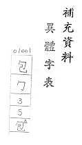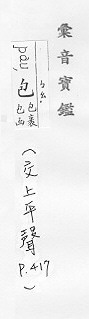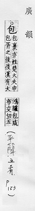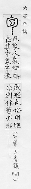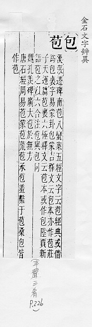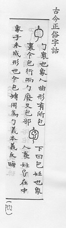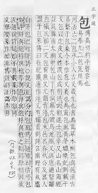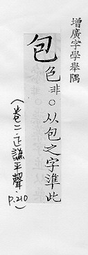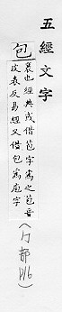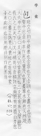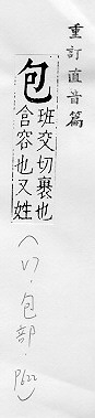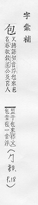 用纸、布或其他薄片把东西裹起来:~装。~饺子。 包好了的东西:邮~。背(bèi )~。 装东西的袋:书~。皮~。 容纳在内,总括在一起:~括。~举(总括)。~容。~涵。~罗万象。无所不~。 总揽,负全责:~销。~揽。 保证:~赔。~在我身上。 约定的,专用的:~饭。~工。 围:~围。~剿。 一种带馅的蒸熟的面食:~子。糖~儿。 身体上肿起的疙瘩:脓~。 姓。
