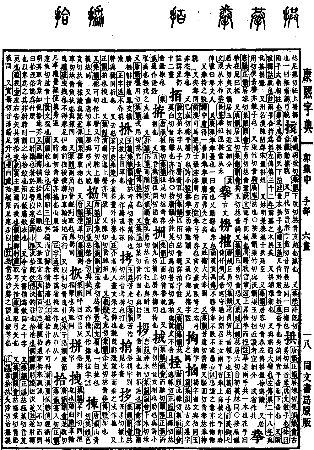 〔古文〕𢮙㩲《唐韵》巨员切《集韵》逵员切,𠀤音权。手也。《玉篇》屈手也。《前汉·钩弋倢伃传》武帝巡守过河闲,召至,女两手皆拳,上自披之,手即时伸,号曰拳夫人。 又《广雅》拳拳,忧也。一曰爱也。又勤恳也,恭也。《前汉·贡禹传》不胜拳拳,不敢不尽愚心。《注》忠谨之意。亦作惓惓。 又奉持之貌。《礼·中庸》得一善则拳拳服膺,而弗失之矣。 又姓。衞大夫拳弥。 又《集韵》苦远切,音绻。又驱圆切,音弮。𠀤奉持貌。 又与弮同。《前汉·司马迁传》士张空拳,冒白刃。《注》拳,弓弩弮也。言矢尽,故张弩之空弓,非空拳也。 又已袁切,绻平声。力也。《诗·小雅》无拳无勇。徐邈读。 又通作卷。见卷字注。