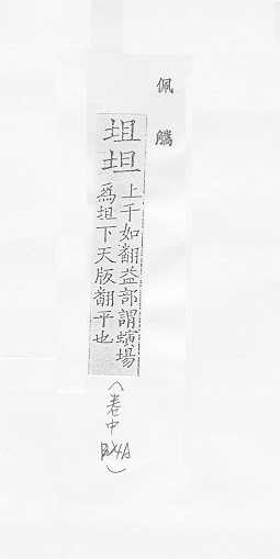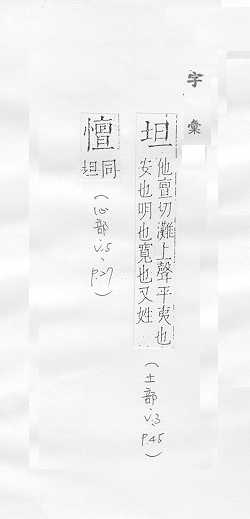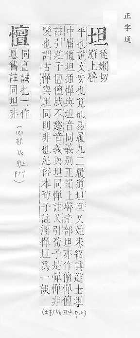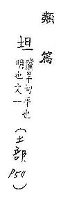 宽而平:平~。~荡。~直(a.平坦笔直;b.坦率)。~途。 心地平静,没有隐瞒:~白。~然。~挚。~诚。~率(shuài )。 “坦腹”的简称,指女婿:~床。令~。