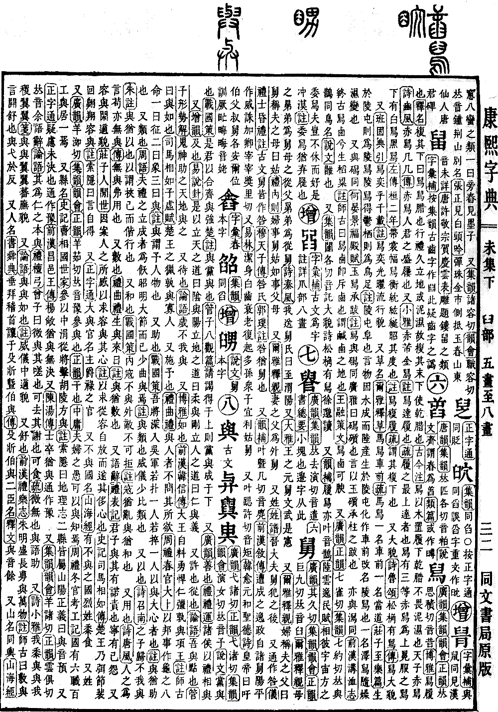 《广韵》其久切《集韵》《韵会》《正韵》巨九切,𠀤音臼。《尔雅·释亲》母之晜弟为舅,母之从父晜弟为从舅。《诗·秦风》我送舅氏,曰至渭阳。又《大雅》王之元舅,文武是宪。 又《尔雅·释亲》妇称夫之父曰舅,称夫之母曰姑。《礼·内则》妇事舅姑,如事父母。 又《尔雅·释亲》妻之父为外舅。 又姓。《姓谱》晋大夫舅犯之后。 又通作咎。《仪礼·士昏礼注》古文舅皆作咎。《𥡆天子传》咎氏。《郭璞注》咎犹舅也。 又《韵补》叶暨几切,音麂。《前汉·叙传》遭成之逸,政自诸舅。阳平作威,诛加卿宰。宰,奖里切。又《易林》洁身白齿,衰老复起。多孙众子,宜利姑舅。 又叶跽许切,音矩。《韩愈·元和圣德诗》皇帝曰吁,伯父叔舅。各安尔位,训厥甿畮。畮音姥。