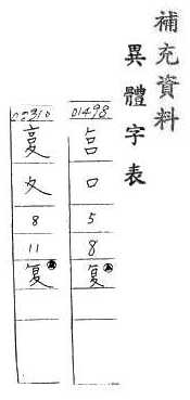 回去,返:反~。往~。 回答,回报:~命。~信。~仇。 还原,使如前:~旧。~婚。~职。光~。~辟。 再,重来:~习。~诊。~审。~现。~议。 许多的,不是单一的:重(chóng)~。繁~。~杂。~姓。