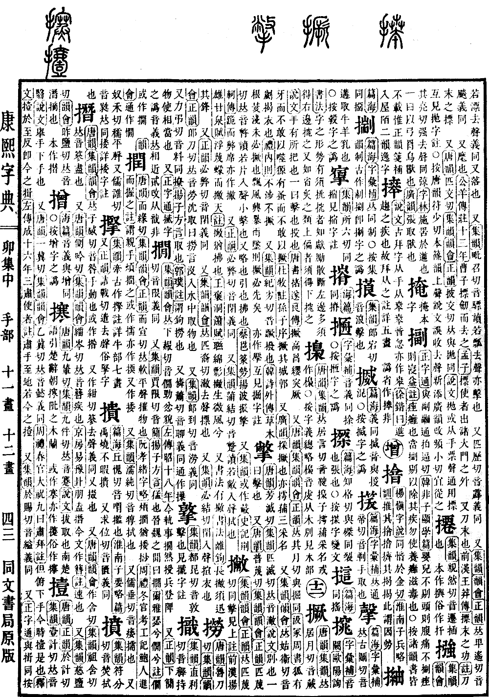 《唐韵》芳灭切《集韵》匹灭切,𠀤音潎。《说文》别也。一曰击也。 又《唐韵》普蔑切《集韵》《韵会》《正韵》匹蔑切,𠀤音瞥。读若片入声。小击也。又略也,引也,拂也。《蔡邕·篆势》扬波振撆。 又《集韵》或作蔽。《史记·荆轲传》跪而弊席。亦作撇。 又《正韵》必弊切,音闭。义同。 又《集韵》蒲结切,音蹩。读若敝入声。拭也。