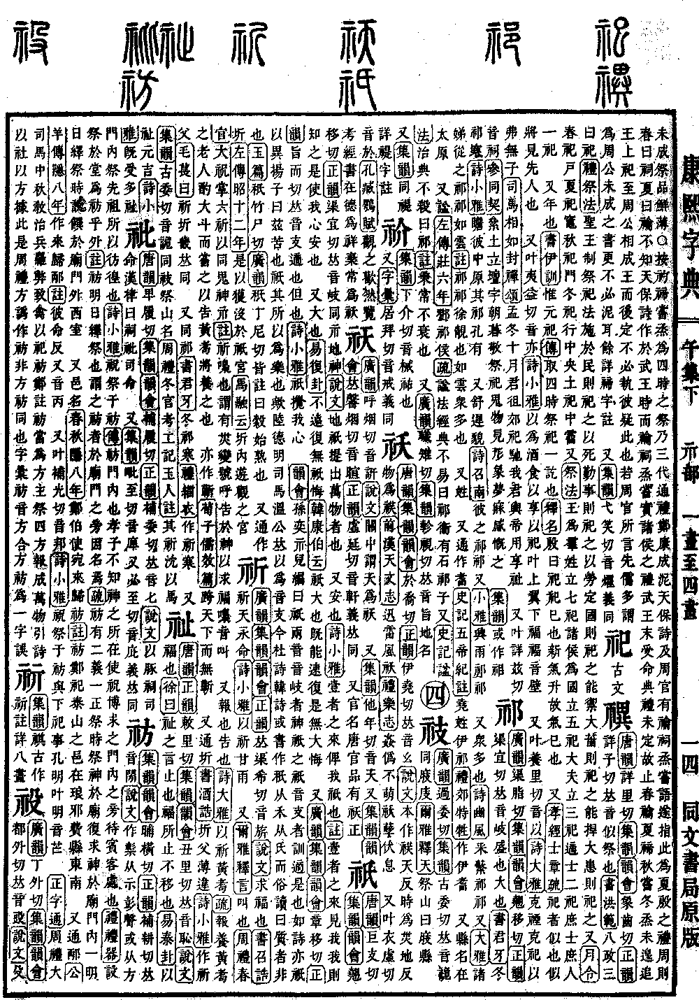 《集韵》《韵会》晡横切《正韵》补耕切,𠀤音閍。《说文》作𥛱。从示,彭声。或从方,门内祭先祖,所以彷徨也。《诗·小雅》祝祭于祊。《传》祊,门内也。孝子不知神之所在,使祝博求之门内之旁,待宾客处也。《礼·礼器》设祭于堂,为祊乎外。《注》祊,明曰绎祭也。谓之祊者,于庙门之旁,因名焉。《疏》祊有二义,一正祭时,祭神于庙,复求神于庙门内。一明日绎祭时,设馔于庙门外西室。 又邑名。《春秋·隐八年》郑伯使宛来归祊。《注》祊,郑祀泰山之邑,在琅邪费县东南。 又通邴。《公羊传·隐八年》作来归邴。《注》彼命反,又音丙。 又叶补光切,音邦。《诗·小雅》祝祭于祊,与下祀事孔明叶。明音芒。 《正字通》周礼大司马,中秋敎治兵,罗弊致禽以祀祊。郑注:祊,当为方,主祭四方,报成万物。引《诗》:以社以方。据此是《周礼》方譌作祊,非方祊同也。《字汇》祊音方,合方、祊为一字,误。