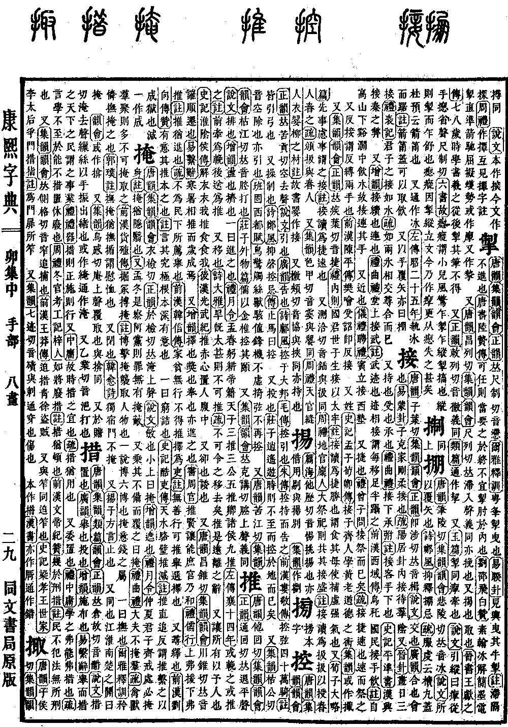 《唐韵》他回切《集韵》《韵会》《正韵》通回切,𠀤退平声。《说文》排也。《增韵》荡也,挤也。一曰进之也。《礼·月令》孟春躬耕帝籍,天子三推,三公五推,卿诸侯九推。《左传·襄十四年》或挽之,或推之。《注》前牵为挽,后送为推。 又移也。《诗·大雅》旱既太甚,则不可推。《疏》不可令之移去矣。推是远离之辞。 又让所有以予人也。《史记·淮隂侯传》解衣衣我,推食食我。《后汉·光武纪》推赤心置人腹中。 又却也,诿也。 又《唐韵》昌锥切《集韵》《韵会》川锥切,𠀤音䜅。顺迁也。《易·系辞》寒暑相推,而岁成焉。 又《增韵》择也,奖也,奉也。亦进之也。《书·周官》推贤让能,庶官乃和。《礼·儒行》上弗援,下弗推。《注》推犹进也。《疏》不为民下所荐举也。《前汉·韩信传》家贫无行,不得推择为吏。《注》无善行可推举选择也。 又寻绎也。《前汉·刘向传赞》有意其推本之也。《注》言其究极根本,深有意也。 一曰穷诘也。《史记·酷吏传》天水骆璧推减。《注》推,直追反,谓推系之以成狱也。减一作成。