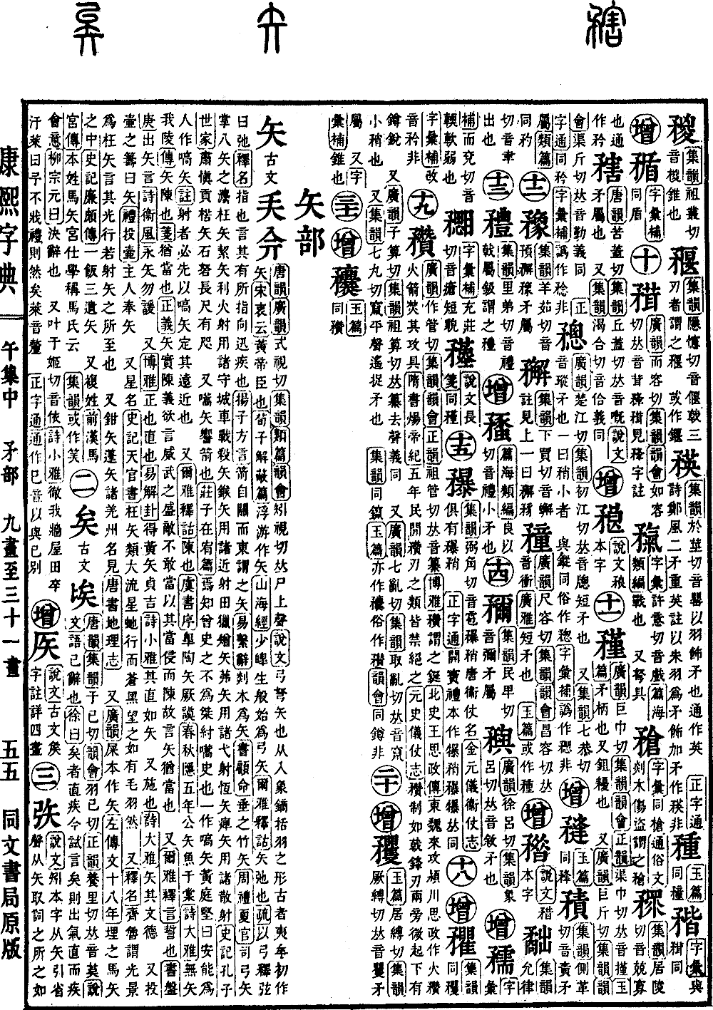 〔古文〕𠂕𠓡《唐韵》《广韵》式视切《集韵》《类篇》《韵会》矧视切,𠀤尸上声。《说文》弓弩矢也。从入,象镝括羽之形。古者夷牟初作矢。《宋衷云》黄帝臣也。《荀子·解蔽篇》浮游作矢。《山海经》少皡生般,始为弓矢。《尔雅·释诂》矢,弛也。《疏》以弓释弦曰弛。《释名》指也,言其有所指向,迅疾也。《扬子·方言》箭,自关而东谓之矢。《易·系辞》剡木为矢。《书·顾命》垂之竹矢。《周礼·夏官》司弓矢,掌八矢之灋。枉矢,絜矢,利火射,用诸守城车战。杀矢,鍭矢,用诸近射田猎。矰矢,茀矢,用诸弋射。恒矢,𤷒矢,用诸散射。《史记·孔子世家》肃愼贡楛矢石砮,长尺有咫。 又嚆矢,响箭也。《庄子·在宥篇》焉知曾史之不为桀纣嚆史也。一作嗃矢。黄庭坚曰:安能为人作嗃矢。《注》射者必先以嗃矢定其远近也。 又《尔雅·释诂》𨻰也。《虞书序》臯陶矢阙谟。《春秋·隐五年》公矢鱼于棠。《诗·大雅》无矢我陵。《传》矢,𨻰也。《笺》犹当也。《正义》矢实𨻰义,欲言威武之盛,敌不敢当,以其当侵而𨻰,故言矢犹当也。 又《尔雅·释言》誓也。《书·盘庚》出矢言。《诗·衞风》永矢勿谖。 又《博雅》正也。直也。《易·解卦》得黄矢贞吉。《诗·小雅》其直如矢。 又施也。《诗·大雅》矢其文德。 又投壷之筹曰矢。《礼·投壷》主人奉矢。 又星名。《史记·天官书》枉矢,类大流星,虵行而苍黑,望之如有毛羽然。 又《释名》齐鲁谓光景为枉矢,言其光行若射矢之所至也。 又钳矢,蓬矢,诸羌州名。见《唐书·地理志》。 又《广韵》屎本作矢。《左传·文十八年》埋之马矢之中。《史记·廉颇传》一饭三遗矢。 又复姓。《前汉·马宫传》本姓马矢,宫仕学,称马氏云。 《集韵》或作𥬘。