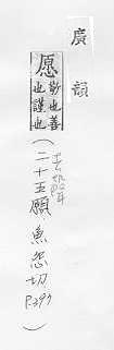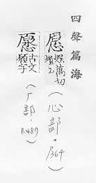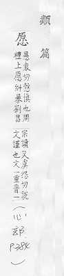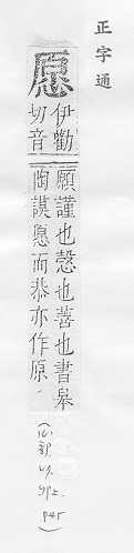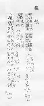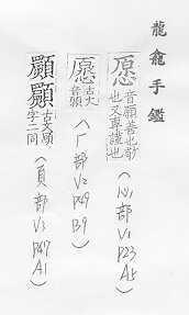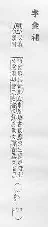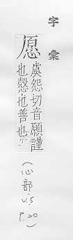 乐意,想要:宁~。~意。情~。自~。 希望:~望。志~。但~。夙~(亦作“宿愿”)。如~以偿。事与~违。 迷信的人对神佛许下的酬谢,泛指许给别人的好处:许~。还~。 老实谨慎,恭谨。===汉英互译===